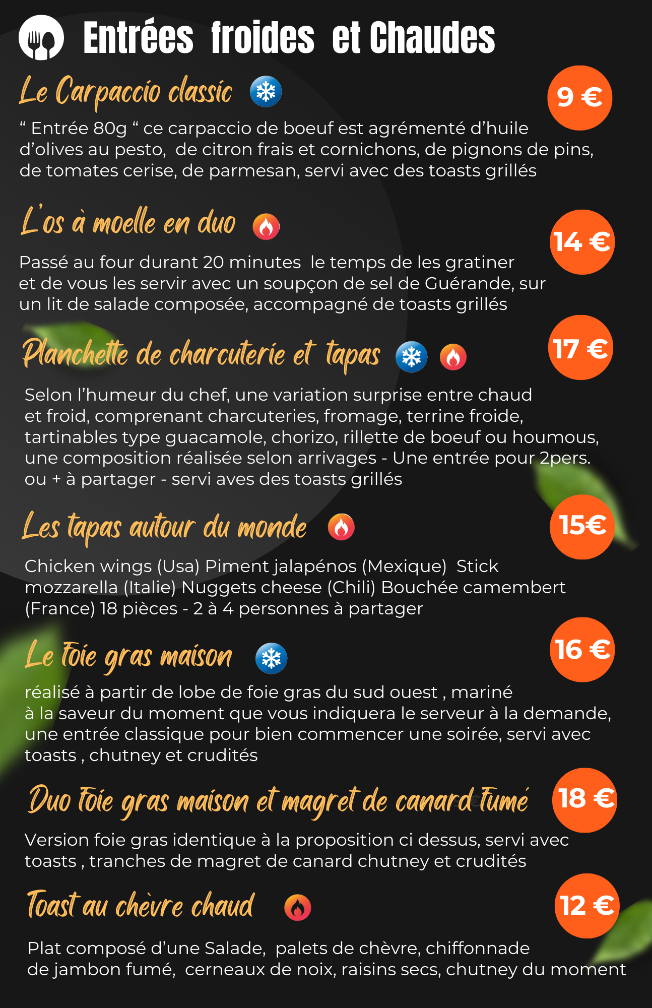 Parmi les spécialités pour les amateurs Ribs de boeuf et Os à moelle vous sont également proposé.